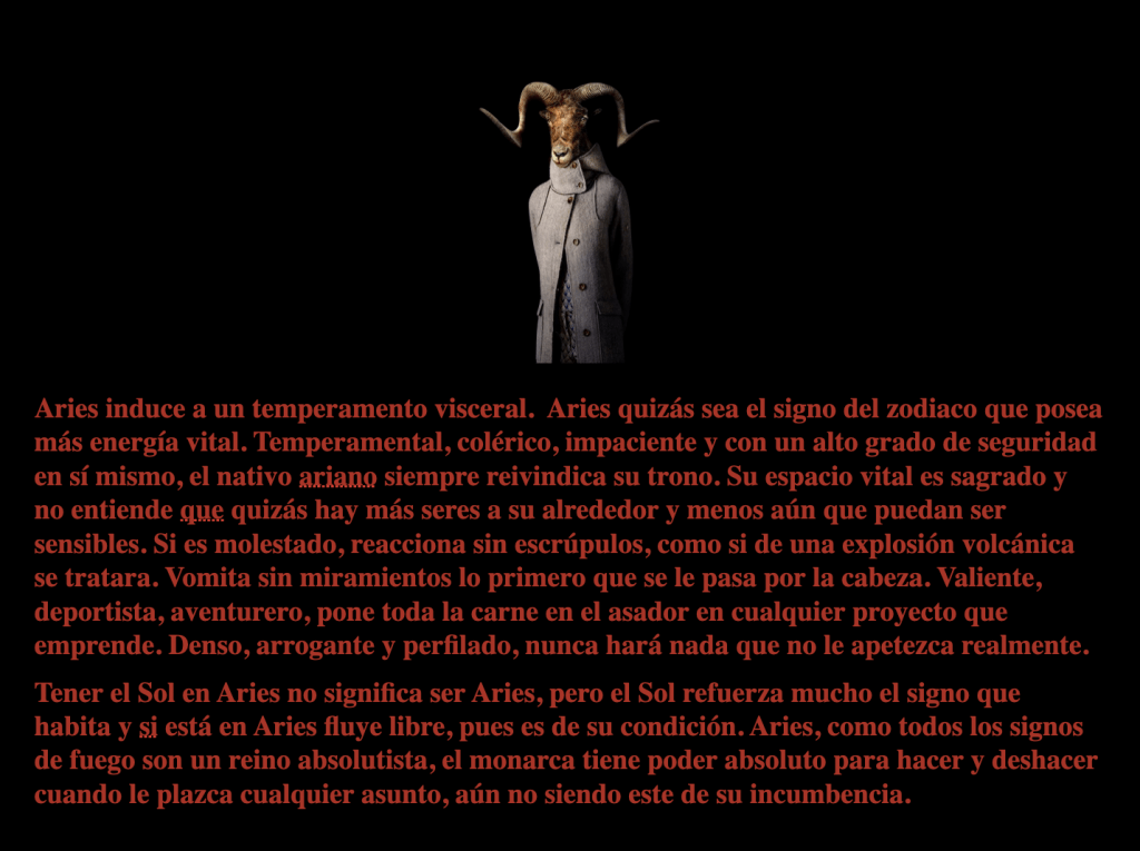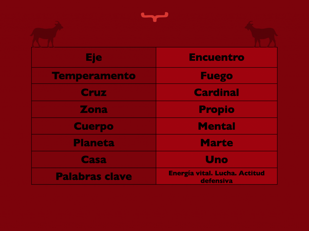 Signo de fuego cardinal. Planeta regente Marte. Cuerpo anímico: mental. Zona de relación: el propio. Eje activo de contacto. Perteneciente a la casa uno.