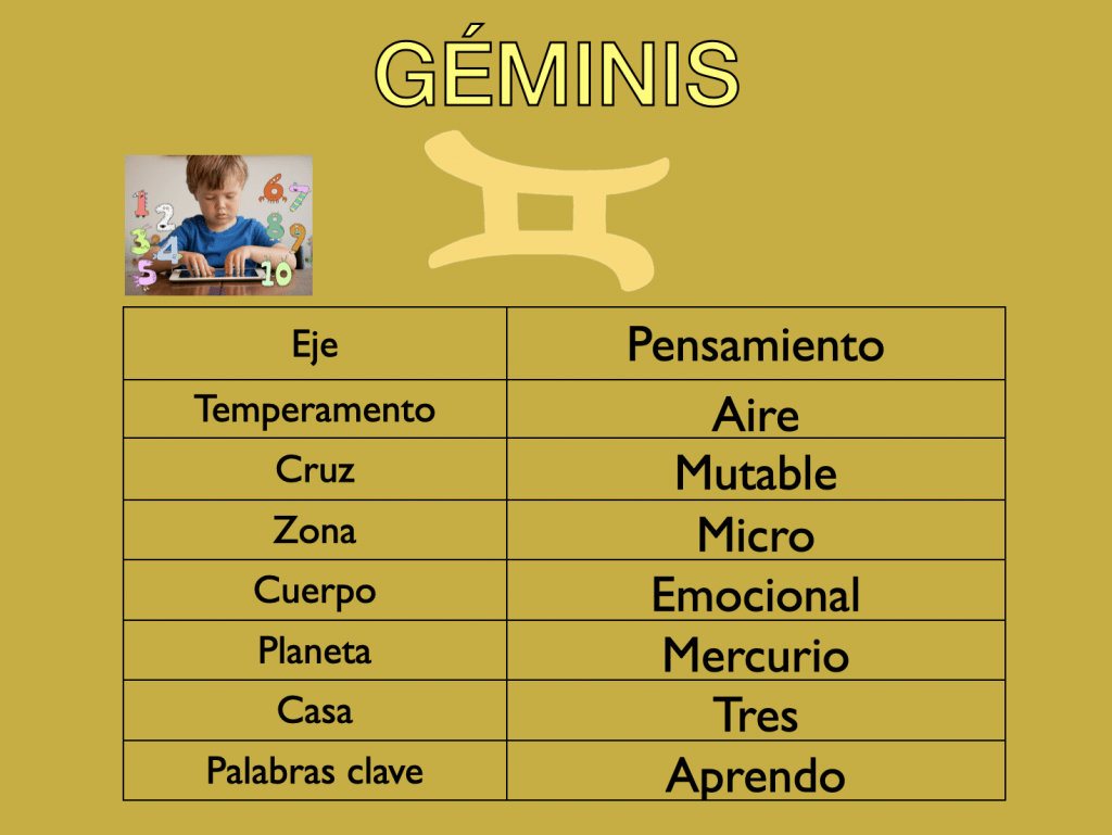 Signo de aire mutable. Planeta regente Mercurio. Cuerpo anímico: emocional.  Zona de relación: el micro. Eje activo de pensamiento. Perteneciente a la casa tres.