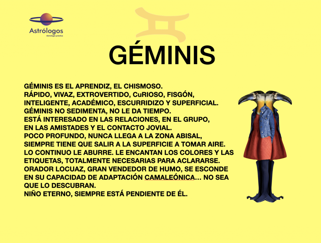Géminis es el signo del aprendizaje, de la curiosidad, del cambio. A Géminis le gusta aprender, porque en el aprendizaje está implícito el cambio y el cambio le encanta a Géminis. Podemos encontrar músicos, estilistas, periodistas, escritores y gente de vida fácil. Mentiroso y camaleónico, Géminis suele salirse con la suya y si no le da igual se adapta y busca sus ventajas.